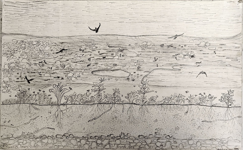 My initial study, an argumentative drawing of the soil's section, revealed an intricate, non-linear network of pockets and pathways defined by roots and porosity. This observation became the core design logic. The resulting structure is a monolithic, continuous form where program spaces are fluid ‘chambers’ connected by a meandering path, mirroring the structure of subterranean tunnels. This form is realized through the fusion of locally sourced materials: mud brick walls reinforced by an internal bamboo mesh. The mud provides the thick, breathable mass that directly grounds the shelter, allowing it to act as a continuous earth form that regulates the humid coastal air. The bamboo acts like the dense root system, giving crucial tensile strength to the organic curves. This material choice ensures the shelter is not just placed on the site, but emerges from the ground to function as a direct, productive extension of the site’s earth ecology.